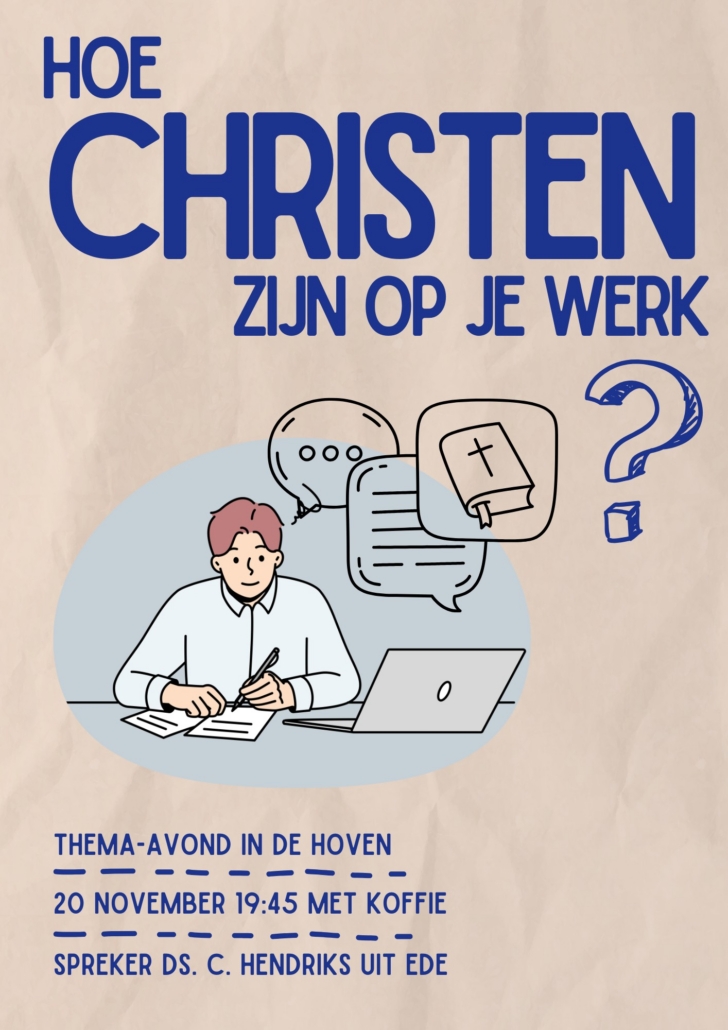 Wat betekent het om christen te zijn op je werk? Wat is daarin belangrijk, en hoe geef je daar in deze tijd vorm aan? Op 20 november hoopt ds. C. Hendriks uit Ede hierover te komen spreken in De Hoven. Met 35 jaar ervaring in de financiële wereld en een achtergrond in zowel economie als theologie, zal hij ons helpen nadenken over vragen als: Wat betekent mijn geloof voor mijn werk? Wat is de kracht daarvan voor anderen? Hoe vertaal ik dat concreet naar mijn dagelijkse praktijk? De zendingscommissie nodigt iedereen van harte uit voor deze inspirerende avond. Aanvang: 20.00 uur. Locatie: De Hoven.
